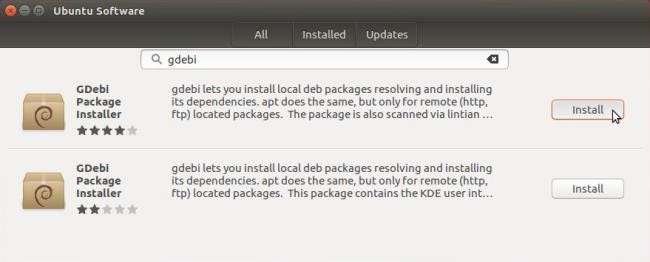 GDebi Package Installer är en grafisk lösning som kompletterar programvaruappen genom att installera .deb-filer som lagras lokalt på din dator. GDebi är ett utmärkt installationsverktyg i sig och har en strömlinjeformad process med åtkomst till förvaret för beroendeberoende. GDebi finns i standardförvaret för Ubuntu 16.04, så vi kan använda Ubuntu Software-appen för att installera det. Något ironiskt, ja, vi kommer att använda Ubuntu Software för att kringgå problemet med Ubuntu Software.