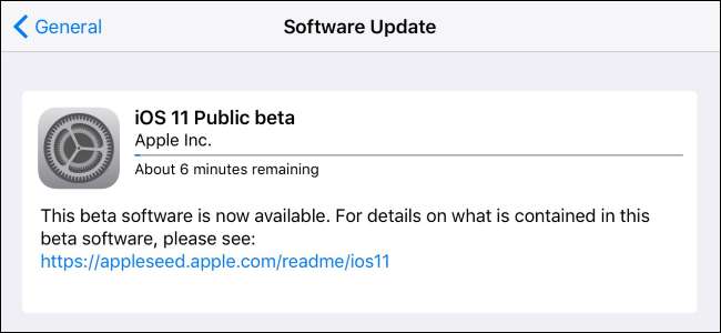 När telefonen eller surfplattan har startats upp igen och med en sund batteritid, navigerar du till Inställningar> Allmänt> Programuppdatering. När du trycker på den ska du se en post för "iOS 11 Public beta". Du kanske ser en något nyare version om du läser den här självstudien när ytterligare betauppdateringar har rullats ut.
