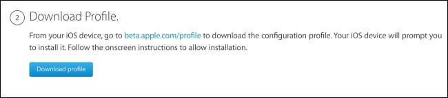 Starta Safari på din iPhone eller iPad och navigera till https://beta.apple.com/profile . Logga in på samma Apple-konto som du länkade till betatestningsprogrammet om du uppmanas till det. Rulla ner, leta efter steget "Ladda ner profil" och tryck på knappen "Ladda ner profil".