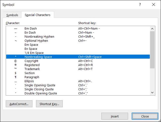 I Symbol fönstret som visas klickar du på fliken specialtecken. Välj ”Hårt Space” i listan, klicka på ”Infoga” och sedan ”Close”.