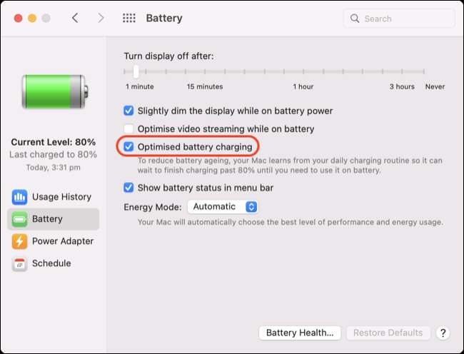 Du hittar den här inställningen under Systeminställningar och GT; Batteri & GT; Batteri. När din Mac har lärt dig dina dagliga vanor, väntar den innan den laddar din enhet helt så att cellen spenderar mindre tid på 100 procent. Läget introducerades först i MacOS Catalina så om du Försök uppdatera och Din Mac är inte kompatibel med den här versionen av OS Då är du otur.