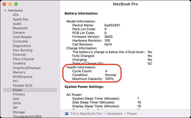 För ett mer detaljerat utseende inklusive laddningscykelräkning, klicka på Apple-logotypen i det övre vänstra hörnet av din skärm följt av "Om den här Mac" och klicka sedan på "Systemrapport" på fliken "Översikt". Bläddra ner till "Power" och under "Hälsoinformation" Du borde kunna se batteriets cykelräkning.