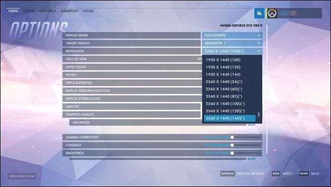 - Du spelar ett spel och det spelet har sina egna integrerade grafiska inställningar. Du kan behöva välja bildskärmens ursprungliga upplösning och uppdateringsfrekvensen 120Hz eller 144Hz i varje spels grafikalternativmeny eller så kan spelet använda en lägre uppdateringsfrekvens.
