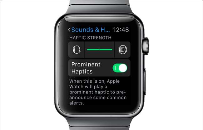 För att minska vibrationens styrka på klockan, dra helt enkelt skjutreglaget "Haptic Strength" till mitten och stäng av "Prominent Haptic". Detta sparar också lite batteritid på din klocka.