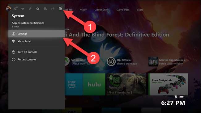 Från Xbox-startskärmen trycker du på Xbox-knappen på din handkontroll (den runda knappen med Xbox-logotypen som tänds). Välj inställningskugghjulet längst till höger, följt av "Inställningar".