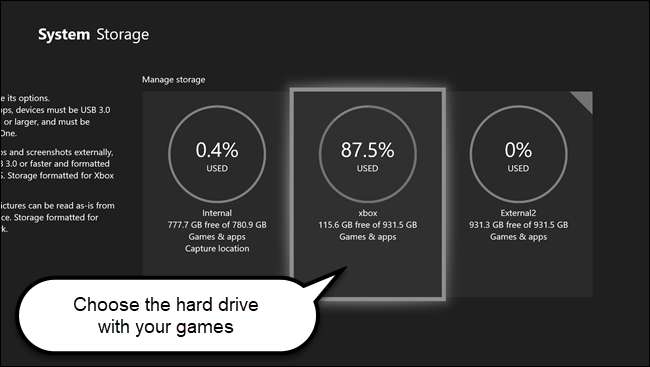 Här väljer du hårddisken som dina spel för närvarande finns på. Om du aldrig har använt en extern hårddisk tidigare väljer du alternativet Internt. Vi väljer hårddisken "xbox".