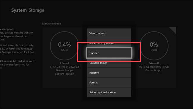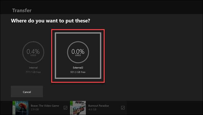 Välj den enhet du ska överföra dina spel till. I det här fallet väljer vi en tom extern hårddisk med namnet "Extern2".
