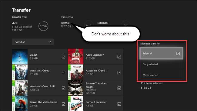 Välj de enskilda spelen du vill överföra eller välj “Välj alla” för att överföra alla spel. Välj "Copy Selected" för att kopiera spelfiler till den externa enheten. Du kan använda ”Flytta valt” för att flytta spelfilerna till den externa enheten och ta bort källkopian från deras ursprungliga plats, men du vill bara göra detta om du frigör utrymme, till exempel en fullständig intern hårddisk.
