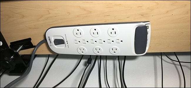 Men om du har ett vanligt skrivbord kan du bara montera det på väggen. Målet här är att få bort eluttaget från golvet och till en mer idealisk plats så att alla dina kablar inte dinglar hela vägen ner till golvet.