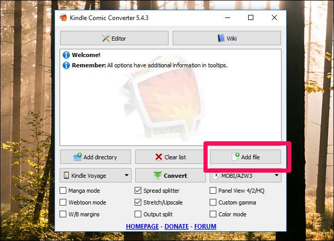 För att starta, ladda ner Kindle Comic Converter och starta den på din dator. För att lägga till en CBR / CBZ-fil (eller grupp av filer), klicka på knappen "Lägg till fil".