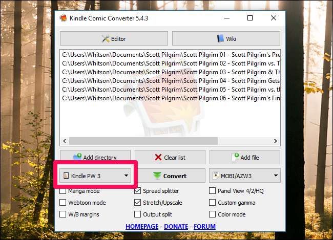 Tyvärr kan Kindle inte läsa vanliga CBR- och CBZ-filer ur lådan. Det finns dock ett praktiskt verktyg som heter Kindle Comic Converter på Windows, macOS och Linux som kan konvertera dina serier till ett Kindle-vänligt format och optimera dem så att du får bästa möjliga läsupplevelse. (Obs! Trots sitt namn kan Kindle Comic Converter också optimera böcker för Kobo, Nook och andra äreaders .)