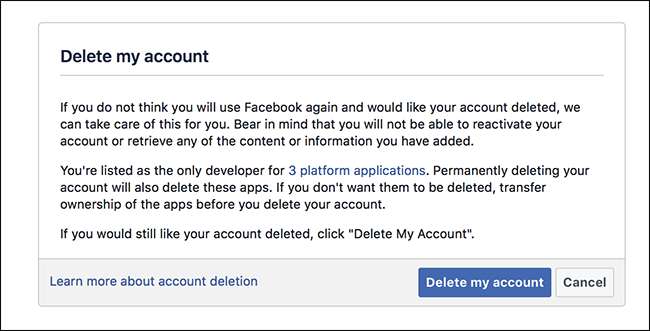 Att ta bort ditt Facebook-konto är tekniskt enkelt . Bege sig till sidan för borttagning av konto , klicka på knappen "Ta bort mitt konto", ange ditt lösenord och en captcha, och bom, det är klart.
