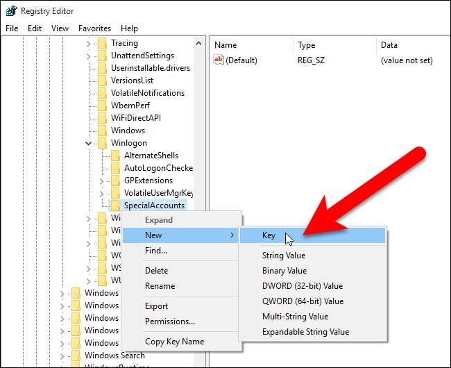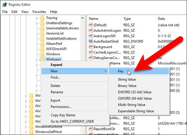 Skapa en ny nyckel under Winlogon-tangenten genom att högerklicka på Winlogon-tangenten och sedan välja Ny> Nyckel i popup-menyn.