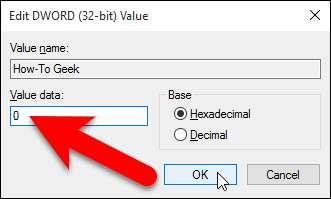 Om datavärdet av någon anledning inte är noll, dubbelklickar du på värdnamnet i den högra rutan och anger 0 i rutan Värddata i dialogrutan Redigera DWORD (32-bitars) värde. Klicka på “OK”.