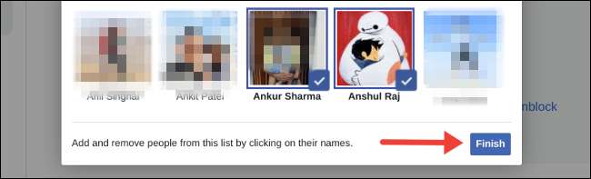 Du bör se ett rutnät av alla dina vänner profilbilder. Välj de vänner du vill begränsa och slå på "Slutför" -knappen.