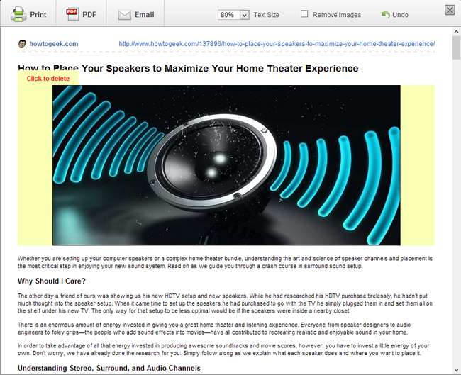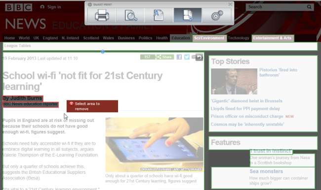 I fönstret för förhandsgranskning av utskrift kan du klicka på valfritt sidelement för att ta bort det - så att du enkelt kan klippa ut annonser och rutor du inte vill ha. Så snart du trycker på utskriftsknappen kommer den vanliga utskriftsdialogen att fungera så att du kan välja att skriva ut i lägre kvalitet för att spara ännu mer bläck.
