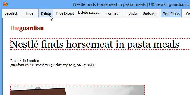 Klicka på valfritt sidelement - vare sig det är text eller bild - och du kan sedan använda det översta verktygsfältet för att välja vad du ska göra. Klicka på Radera och det valda elementet tas bort och resten av sidan flyttas för att fylla i det lediga utrymmet. Du kan också använda alternativet Dölj för att välja att inte skriva ut ett visst objekt utan lämna ett osynligt objekt på plats för att behålla formateringen.