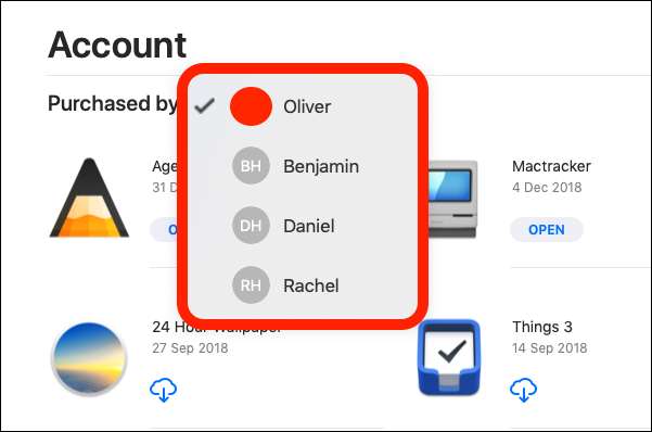 Om du använder Familjedelning kan du välja en familjemedlem för att se alla deras köp också.