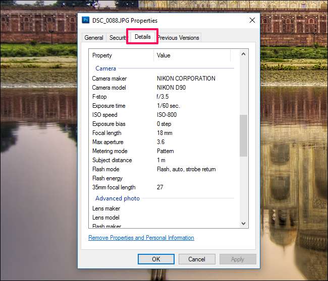 Klicka på fliken "Detaljer" och rulla nedåt - du ser all slags information om den använda kameran och de inställningar som fotot togs med.