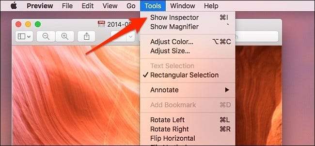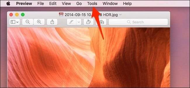 På macOS, genom att öppna ett foto i förhandsgranskning. När du väl har öppnat klickar du på “Verktyg” uppe i menyraden längst upp.