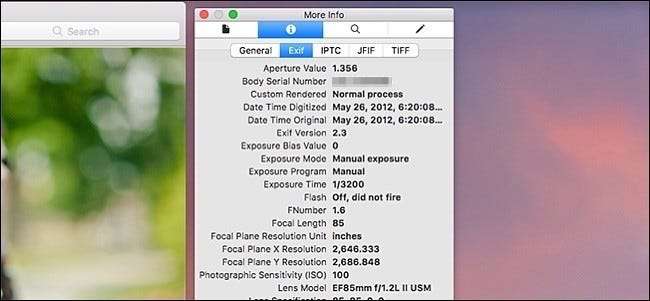 Då ser du en rad avancerad information om fotot, inklusive de olika kamerainställningarna som användes. Det kommer till och med att berätta om blixten användes eller inte. Du kommer inte att se massor av information (eller så ser du generisk information) om ditt foto togs på en smartpone, men du ser mycket på DSLR och andra kameror. Du kan även se serienumret på kamerahuset.