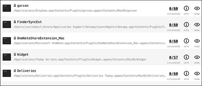 Till exempel finns det macOS-tillägg avsnitt, som innehåller verktyg som ger applikationer möjlighet att integreras med Finder, Notifieringscenter och mer. Du ser namnet på tillägget och dess plats i ditt filsystem tillsammans med information från VirusTotal .