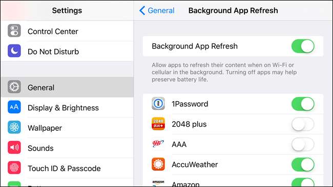 För att förhindra att appar använder data i bakgrunden, navigera till Inställningar> Allmänt> Uppdatera bakgrundsapp. Inaktivera bakgrundsuppdatering för batterisugande appar här och förhindrar dem från att uppdatera sina data i bakgrunden.