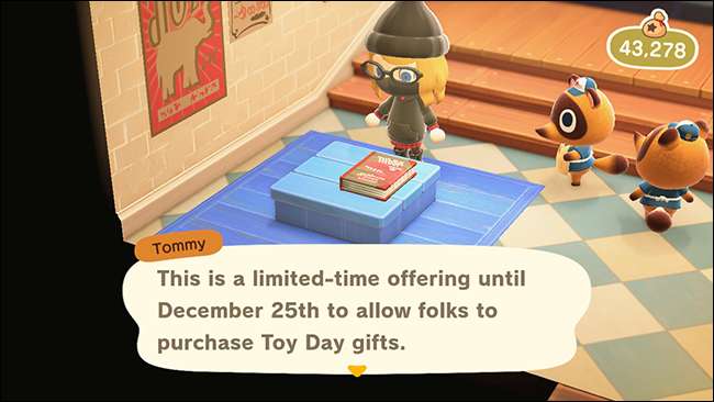 Börjar den 1 december, du kan besöka Nook's Cranny för att hämta leksaker och gåvor för att skicka till dina vänner och familj som är antingen på din ö eller på din vänlista. Om du känner dig extra fancy, kan du också hämta lite förpackningspapper på Nooks Cranny (det är i skåpet) och linda din gåva innan du skickar den.