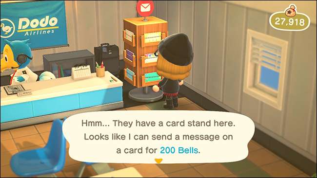 När du först besöker Dodo Airport, kommer Orville att fylla dig på de posttjänster han erbjuder. Till höger om sitt skrivbord ser du ett rack av kuvert som du kan skicka till vänner för 200 klockor. Se till att du är ansluten till Internet och närmar dig vykortstativet. Välj "Skicka en" från Orville menyn för att välja en vän från din lista.