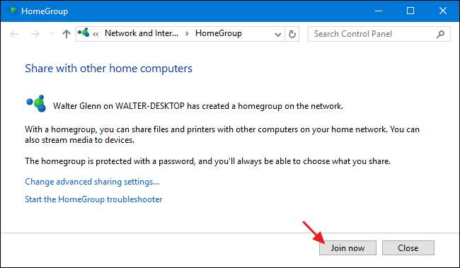 Om det redan finns en hemgrupp skapad för andra datorer i nätverket, men datorn som din skrivare är ansluten till inte är medlem, kommer huvudskärmen när du startar appen Hemgrupps kontrollpanel att se ut som den nedan. Klicka på knappen "Gå med nu" och klicka sedan på "Nästa" på följande skärm som bara berättar lite om hemgrupper.