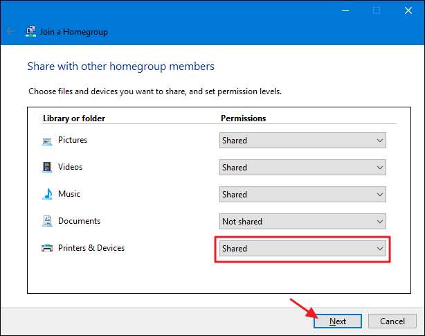 Ställ in dina delningsalternativ, se till att "Skrivare och enheter" är inställt på "Delad" och klicka sedan på "Nästa".