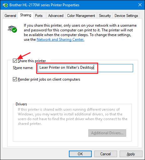 För att fortsätta, aktivera alternativet "Dela den här skrivaren" och, om du vill, ge skrivaren ett vänligare namn så att andra i nätverket lättare kan identifiera skrivaren.