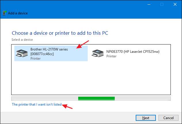 - Min skrivare är lite äldre . Om du väljer det här alternativet kommer Windows att göra en mer grundlig genomsökning av ditt nätverk och leta efter skrivaren. Enligt vår erfarenhet hittar den dock sällan någonting som den inte redan hittade under den första genomsökningen. Det är ett tillräckligt enkelt alternativ att prova, men det kan ta några minuter.