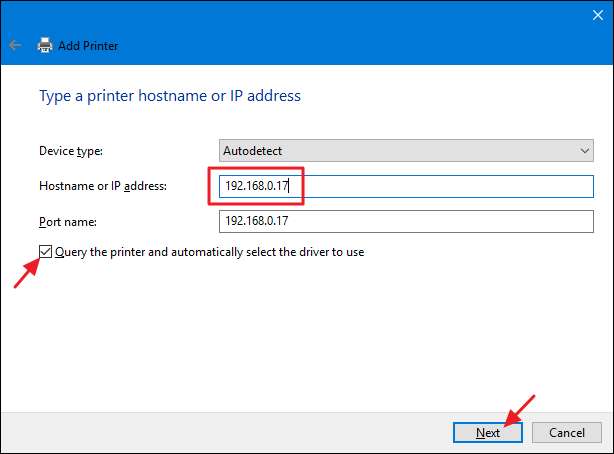 Skriv skrivarens IP-adress i rutan "Värdnamn eller IP-adress". Se till att kryssrutan "Fråga skrivaren och välj automatiskt den drivrutin som ska användas" är markerad och klicka sedan på "Nästa".