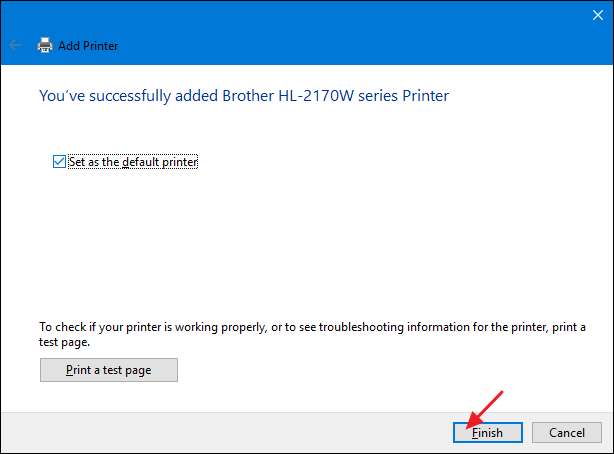 Välj om du vill ställa in den nya skrivaren som standard, skriv ut en testsida om du vill se till att allt fungerar och klicka sedan på "Slutför" när du är klar.