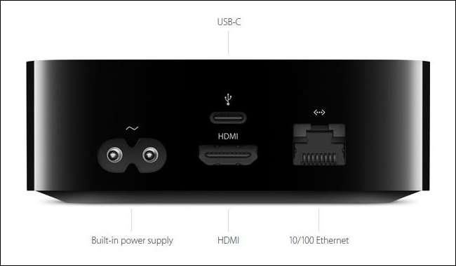 Strömporten är för den medföljande strömkabeln (vilket vi måste säga är en riktigt fin kabel med en iögonfallande retro-kontakt), HDMI-porten är för att koppla din Apple TV till din HDTV eller AV-mottagare och USB-C-porten påverkar konsumenterna lite. Nej, verkligen, vi lovar. Anledningen till att din Apple TV inte levereras med en USB-C-kabel beror på att porten existerar enbart för diagnostiska ändamål och om du inte returnerar din Apple TV för service kommer den sannolikt att bli oanvänd under hela enhetens livslängd.