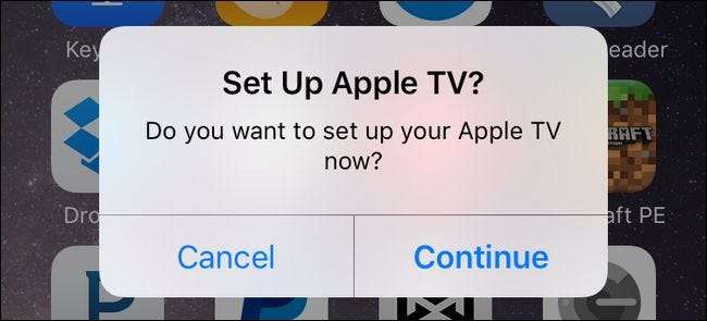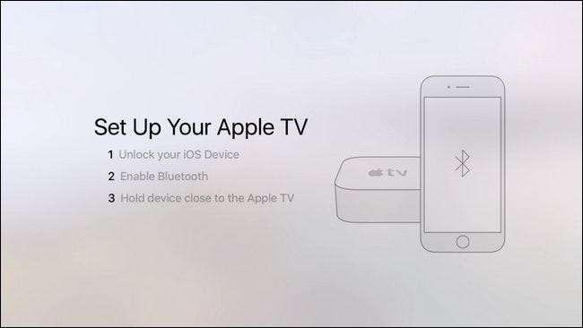 När du väljer "Ställ in med enhet" behöver du helt enkelt följa instruktionerna på snabbskärmen ovan: Lås upp din iOS-enhet, aktivera Bluetooth om den inte redan är på och håll enheten i närheten av din Apple. TV.