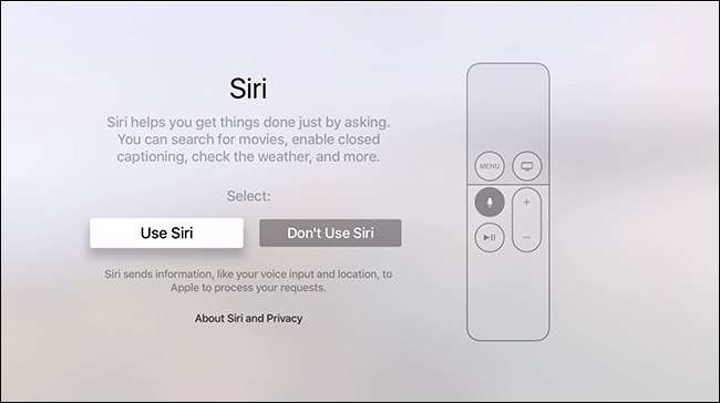 Därefter uppmanas du att aktivera eller inaktivera Siri. Till skillnad från de alltid pågående Amazon Echo- eller iOS-enheterna med funktionen "Hej, Siri" lyssnar inte Apple TV aktivt på ditt vardagsrum för att reagera på dina krav. Precis som röstkontrollen som finns på Amazon Fire TV är Siri endast tillgänglig om du trycker på den dedikerade knappen på fjärrkontrollen och talar in i mikrofonen på fjärrkontrollen.