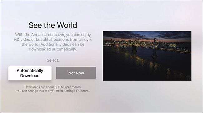 I nästa val "Se världen" uppmanas du att aktivera eller inaktivera den vackra Ariel skärmsläckaren. Om bandbredd inte är ett problem för dig rekommenderar vi starkt att du aktiverar det eftersom det ser riktigt fantastiskt ut. Om bandbredd är en fråga för dig kanske du vill välja "Inte nu" eftersom Apple uppskattar att HD-videobaserade skärmsläckare kommer att suga upp cirka 600 MB per månad i bandbredd.