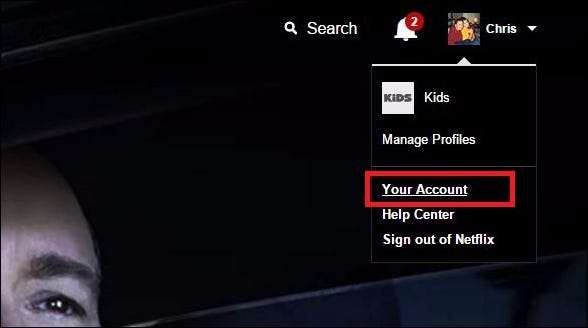 För att starta måste du ange dina kontoinställningar genom att klicka på din profilbild längst upp till höger i Netflix-webbläsarfönstret. Välj sedan alternativet "Ditt konto".