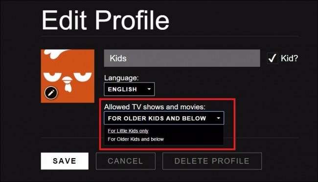 I det här fönstret väljer du alternativet "Hantera profiler". Här kan du redigera den förinställda "Barn" -profilen och ändra vilken visar att de kommer att kunna titta på två av samma kategorier som finns i avsnittet Föräldrakontroll: Små barn och äldre barn (tänk "Dora Explorer" för små barn , “Star Wars” för barn).