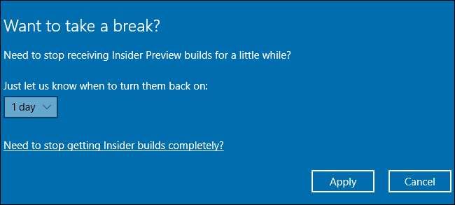 Klicka på "Behöver du sluta få Insider-builds helt?" länk för att välja bort. Du kommer att fortsätta med den nuvarande versionen av Windows 10 tills en ny stabil version anländer, eller tills du väljer tillbaka till Insider Previews.