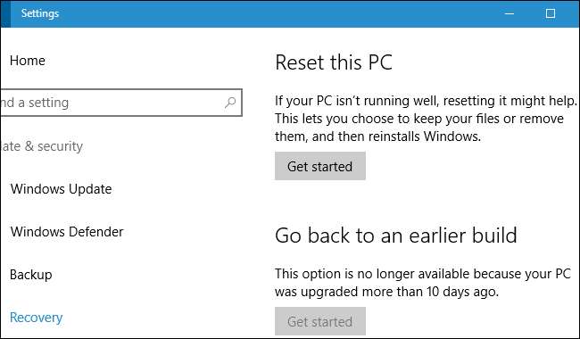 För att kontrollera om du kan göra det, gå till Inställningar> Uppdatering och säkerhet> Återställning. Klicka på knappen "Kom igång" under " Gå tillbaka till en tidigare version ”Om det är tillgängligt.