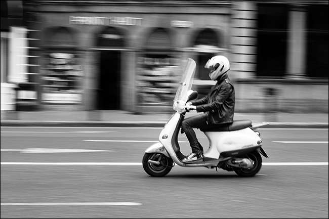 Det andra och svårare alternativet är att hitta ett fordon eller en rörlig person och spåra dem med din kamera när du tar en bild. Här är en jag gjorde av en kille på en motorcykel.