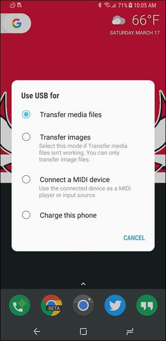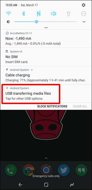Oavsett vilken metod du väljer nedan måste du se till att din telefon är redo att överföra bilder. Fortsätt och anslut din telefon till din dator med en USB-kabel. Dra sedan ner meddelandeskärmen och se till att alternativet att överföra bilder är valt. Alternativet kan faktiskt kallas "Överför bilder", men det kan också kallas "MTP", "PTP" eller till och med bara "Filöverföring." De gör i princip alla samma sak.