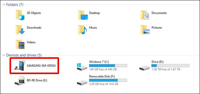 Din telefon ska listas som en enhet. Beroende på hur USB-överföringsalternativet är inställt kan ikonen se ut som en kamera, en bärbar mediaspelare eller kanske till och med en annan enhet. Men ikonen är inte så viktig - var bara uppmärksam på namnet.