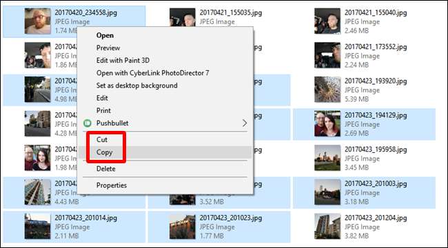 När du har valt dina foton högerklickar du på en av de valda bilderna och väljer sedan kommandot "Kopiera" (du kan också bara trycka på Ctrl + C). Om du vill flytta foton istället för att kopiera dem (vilket tar bort dem från telefonen) använder du kommandot "Klipp ut" istället.
