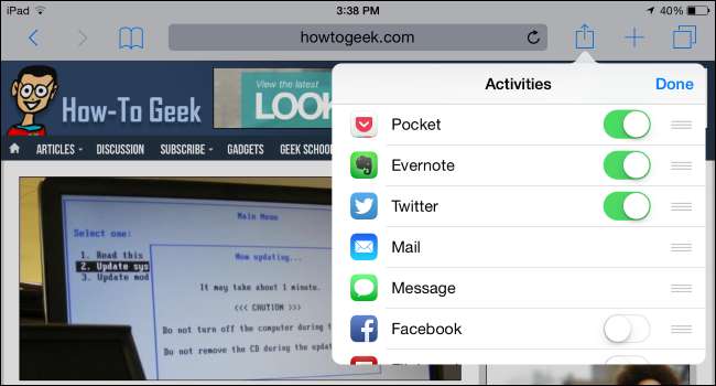 Tryck på Klar när du är klar. Menyn Dela visar nu dina favorittjänster och kommer ihåg dina preferenser. Klicka bara på dem för att dela innehållet från den aktuella appen med dem - tryck till exempel på Pocket för att spara den aktuella sidan i din Pocket-kö eller tryck på Evernote för att spara den aktuella sidan i en Evernote-anteckningsbok.
