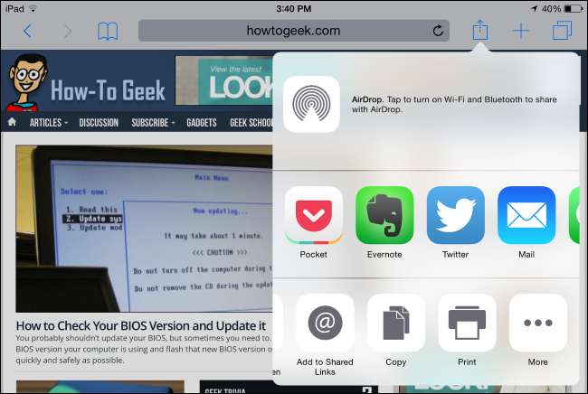 För att komma åt dina Share-tillägg trycker du på Dela-knappen i valfri app. (Det är den rektangeln med en uppåtpil som kommer ut ur den.) Du kan till exempel trycka på knappen Dela i Safari för att dela den aktuella sidan till en annan app.