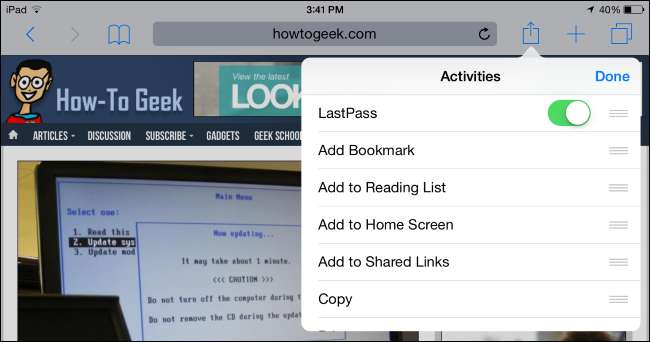Du kan nu trycka på en åtgärd för att använda den. Om du till exempel trycker på LastPass-knappen kan du fylla i lösenord i ditt lösenordsvalv direkt i Safari eller Chrome. Du loggar in på ditt valv om du är utloggad, sparar nya användarnamn och lösenord i LastPass och mer.